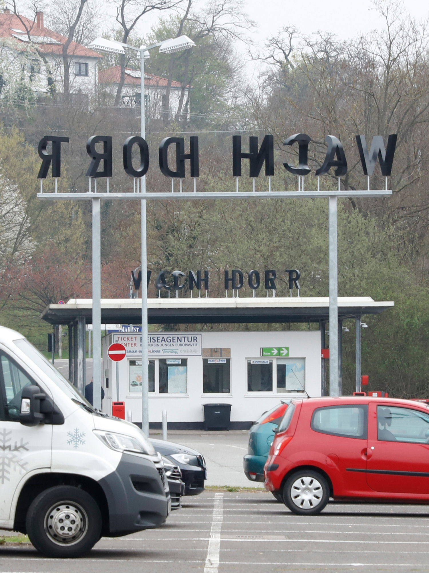 VON HIER / NACH DORT versucht das Charakteristikum eines transitorischen Ortes zu einem „Sprachbild“ zu verdichten, das diese Funktionen des Ortes akzentuiert und weithin sichtbar macht. Aus den Worten VON HIER und NACH DORT wurde ein sprachliches Vexierbild konstruiert, das aus wechselnden Blickwinkeln unterschiedliche Lesarten ermöglicht. Die einzelnen Buchstaben sind als dreidimensionale Schriftkörper ausgeführt, und paarweise so ineinander montiert, dass sie aus bestimmten Betrachtungswinkeln jeweils auf eine andere Weise lesbar werden. Die Schriftobjekte sind an den zwei gegenüberliegenden Seiten des Busbahnhofes angebracht: Einmal auf dem Dach des Schrankenhäuschens an der Ostseite des Platzes und ein zweites mal frei stehend auf einem schmalen Grünstreifen auf der Westseite. Sie markieren so ein Feld in dem, abhängig vom Standort, immer wieder die Worte VON HIER und NACH DORT aufscheinen. Die jeweilige Leseweise korrespondiert unmittelbar mit der Position und Blickrichtung des Betrachters. Blickt man frontal auf den Schriftzug, so verliert er seine eindeutige Lesbarkeit und er erscheint wie ein Stationsname in einer fremden Sprache.