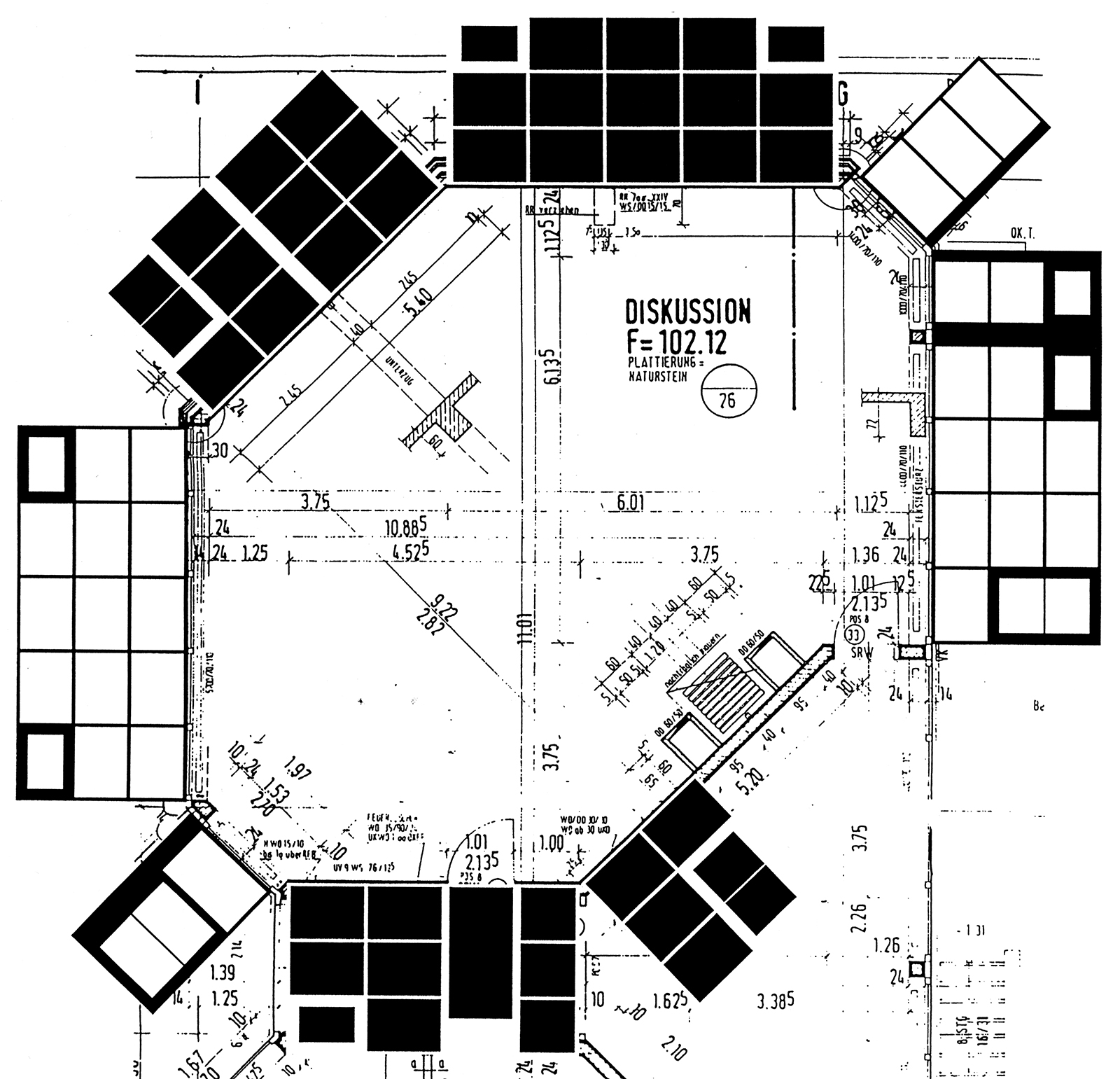 Die Fensterflächen von Raum 26 im Museum Gelsenkirchen sind mit einer transluzenten Folie bezogen, so daß der Blick nach draußen in den umgebenden Park verwehrt bleibt, und sich der Außenraum im Innern lediglich über diffus hinterleuchtete Glasflächen vermittelt. In Fortsetzung dieser Fensterflächen sind auf die Wände des Raumes Flächenraster projiziert. Diese Projektionen greifen in ihrer Gestalt und Proportion die Gitterstruktur der Fensterbänder auf und kehren dabei deren Hell- und Dunkelwerte in ein Negativbild um. So entsteht ein durchlaufendes Fensterband, das den gesamten Raum umfasst und dennoch nichts anderes sichtbar macht als sich selbst.